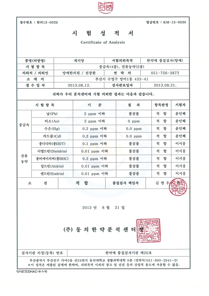 동의한약분석센터 시험성적서 (2013-08-21일자)