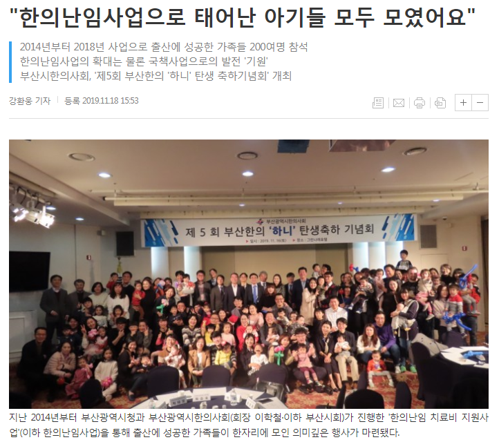 지난 2014년부터 부산광역시청과 부산광역시한의사회(회장 이학철·이하 부산시회)가 진행한 '한의난임 치료비 지원사업'(이하 한의난임사업)을 통해 출산에 성공한 가족들이 한자리에 모인 의미깊은 행사가 마련됐다.