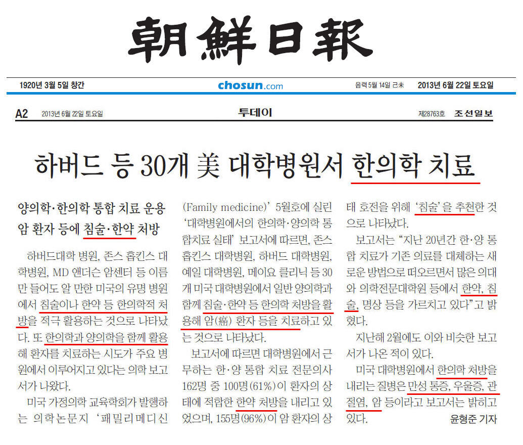 미국 가정의학 교육학회가 발행하는 의학논문지 '패밀리메디신(Family medicine)' 5월호에 실린 '대학병원에서의 한의학·양의학 통합치료 실태' 보고서에 따르면, 존스 홉킨스 대학병원, 하버드 대학병원, 예일 대학병원, 메이요 클리닉 등 30개 미국 대학병원에서 일반 양의학과 함께 침술·한약 등 한의학 처방을 활용해 암(癌) 환자 등을 치료하고 있는 것으로 나타났다.