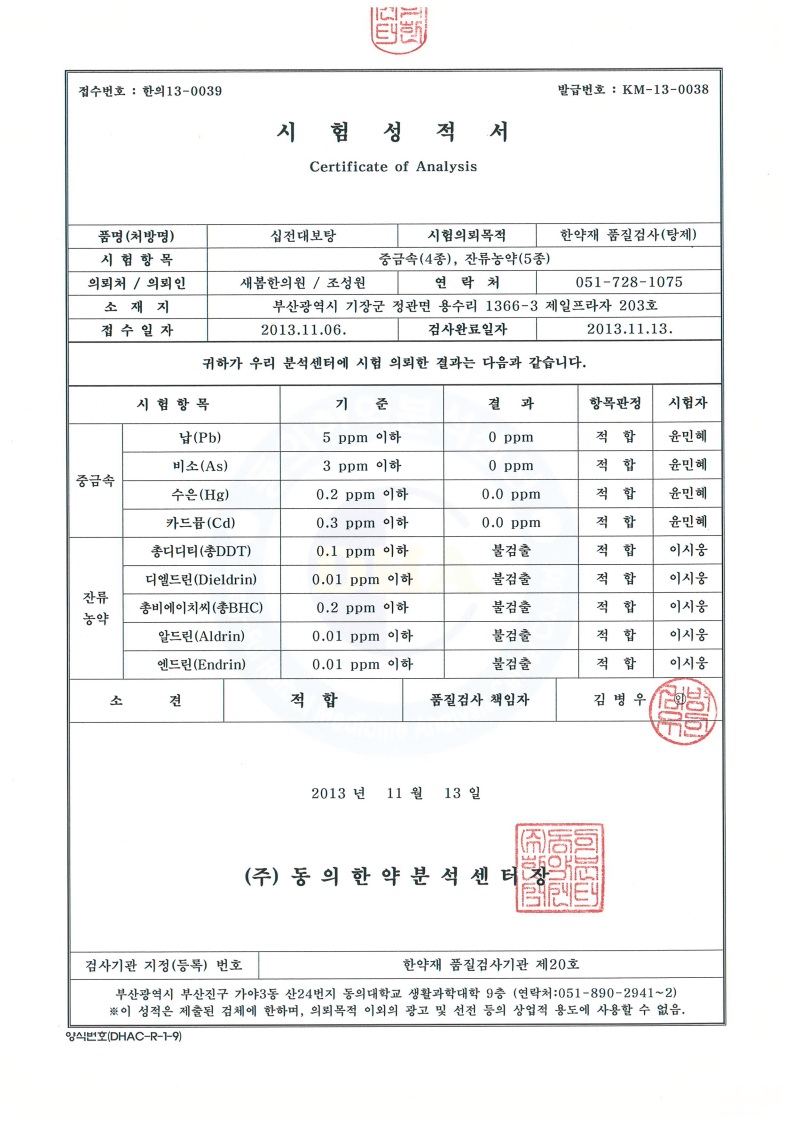 동의한약분석센터 시험성적서 (2013-11-13일자)