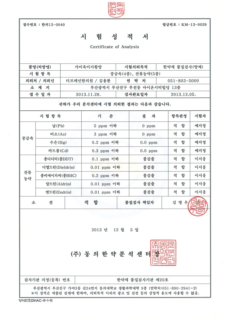 동의한약분석센터 시험성적서