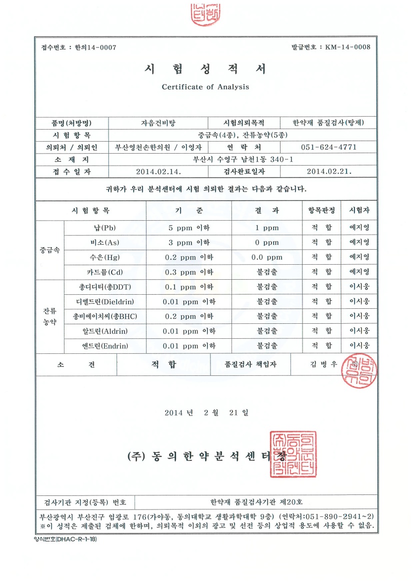 동의한약분석센터 시험성적서
