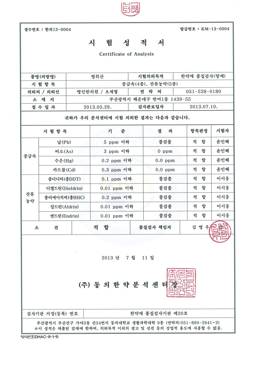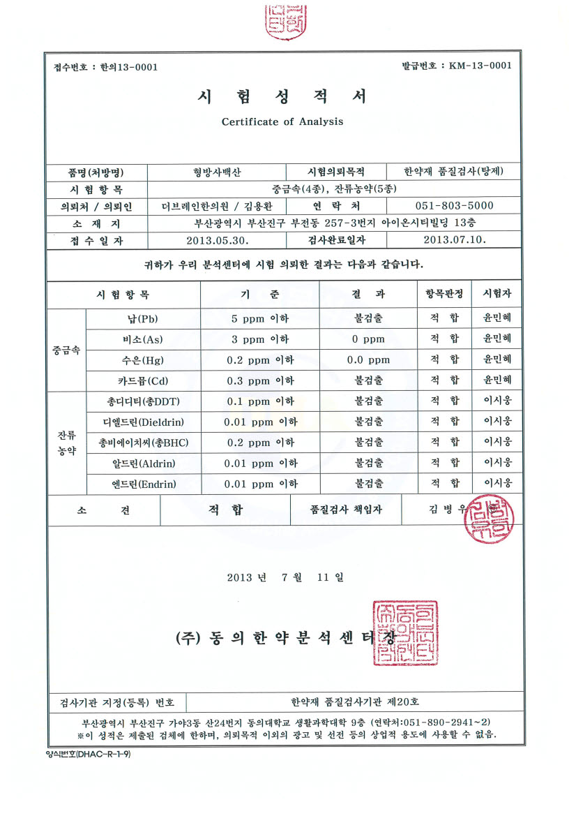 동의한약분석센터 시험성적서 (2013-07-10일자)