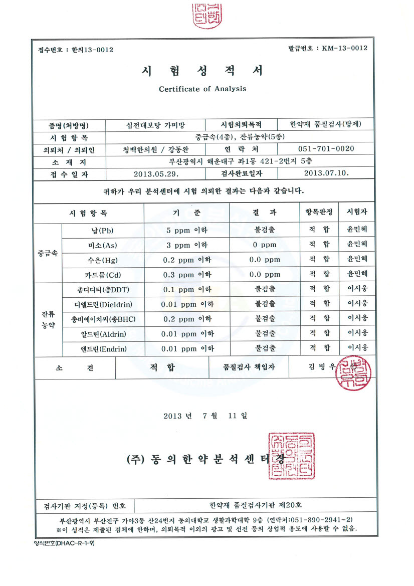 동의한약분석센터 시험성적서 (2013-07-10일자)