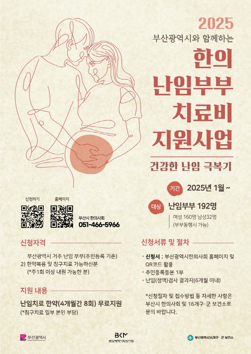 부산광역시와 부산광역시한의사회가 2014년부터 2024년까지 한해도 빠짐없이 진행했던 한의 난임부부 치료비지원사업이 시민분들의 꾸준한 관심 속에 2025년도에도 시행하게 되었습니다.